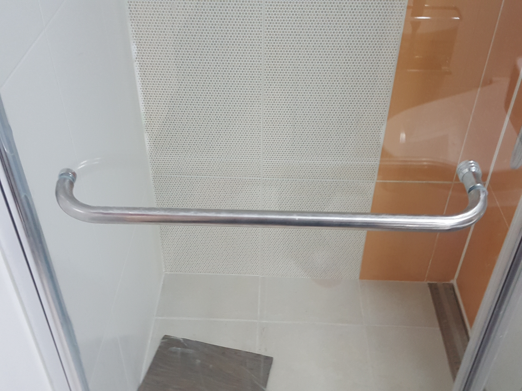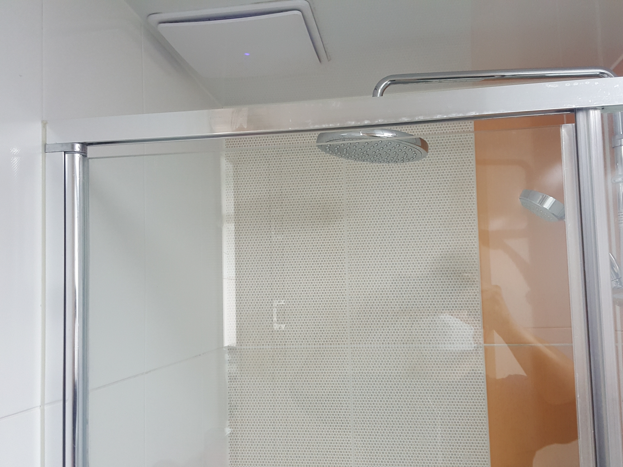 이런 타입의 샤워부스의 경우에는 강화유리가 사진 좌측에 보이는 금속 봉에 실리콘으로 접착이 된 경우로