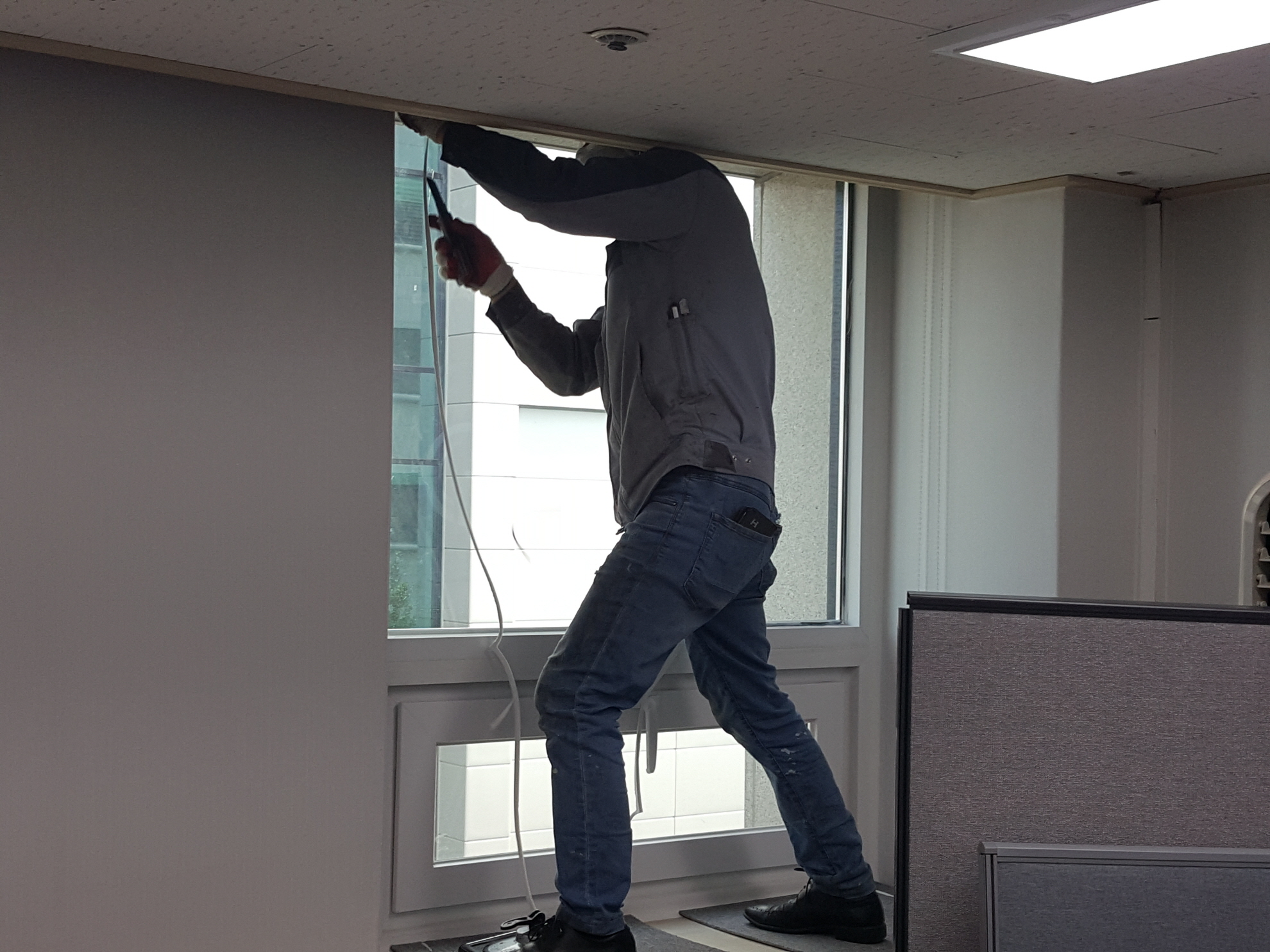 루버 설치를 하고 , 에어컨기사님들이 에어컨을 설치하고 나시면