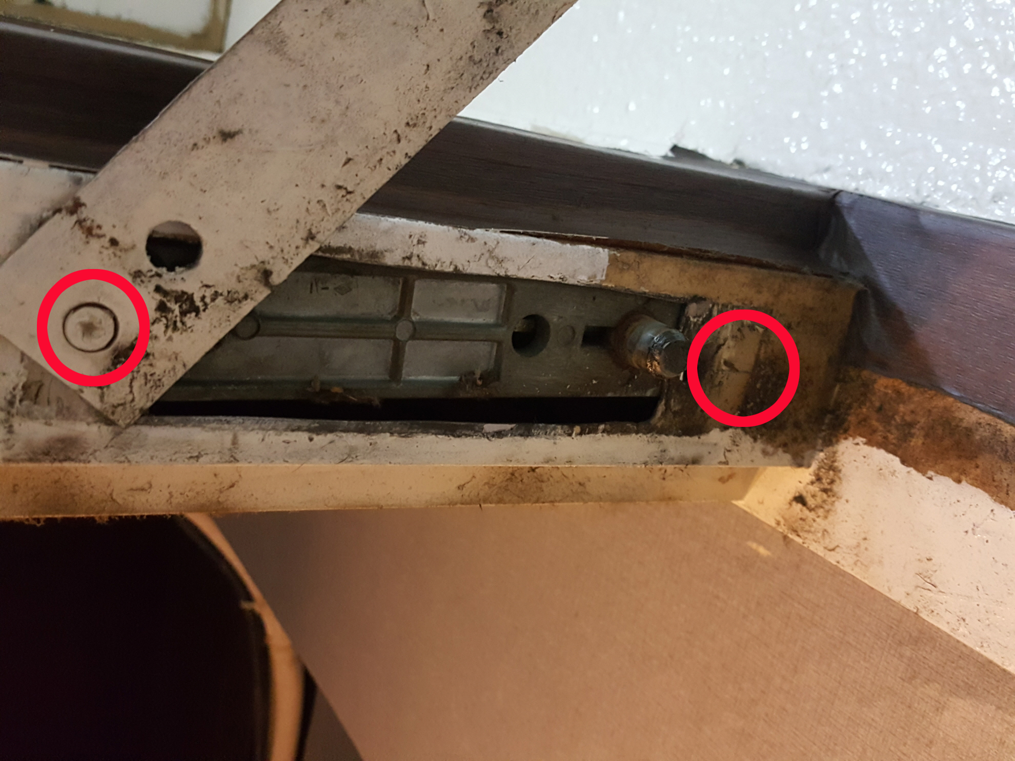 현장에 가보니 아래 사진에 붉은 원으로 표시된, 문 회전축에 문제가 있었습니다.
