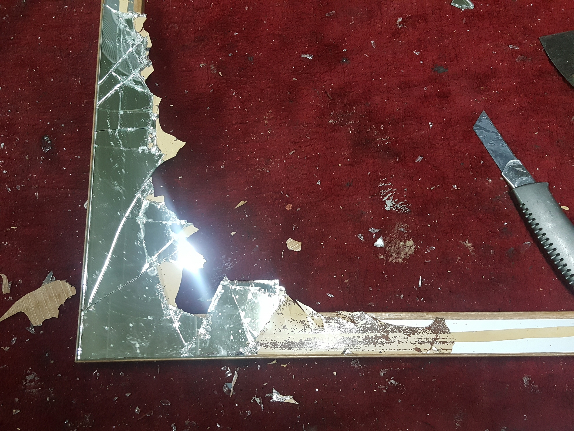 욕실에서 작업을 진행하면 거울파편이 사방에 떨어지게 때문에 위험하고,