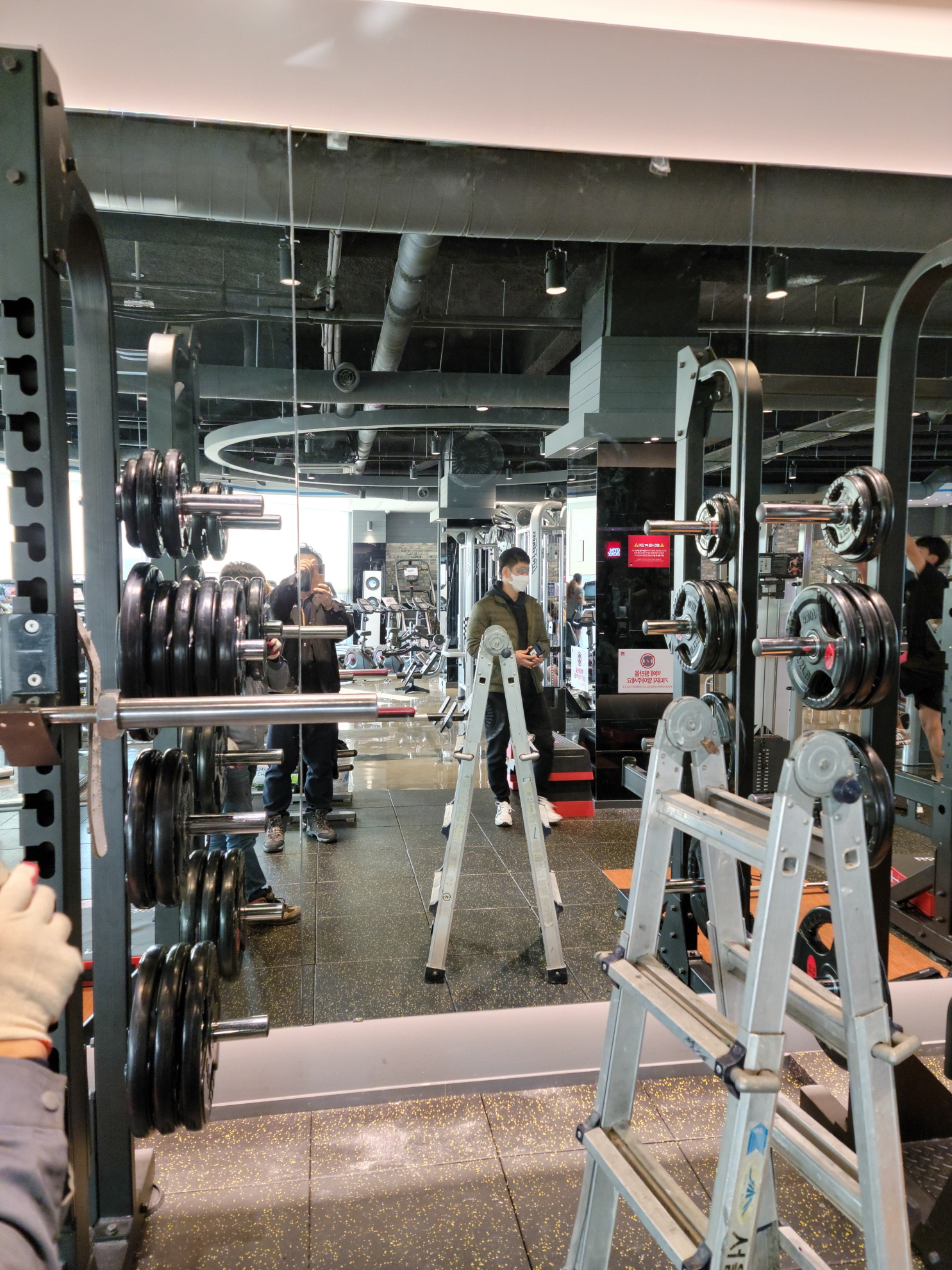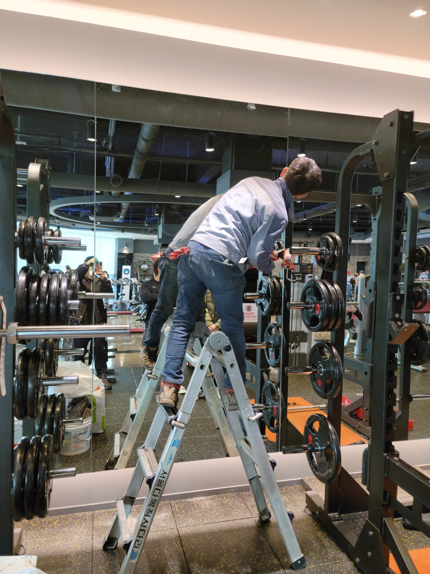 6층까지 계단을 통해 들어올린 거울을 붙이고, 실리콘 작업중입니다.