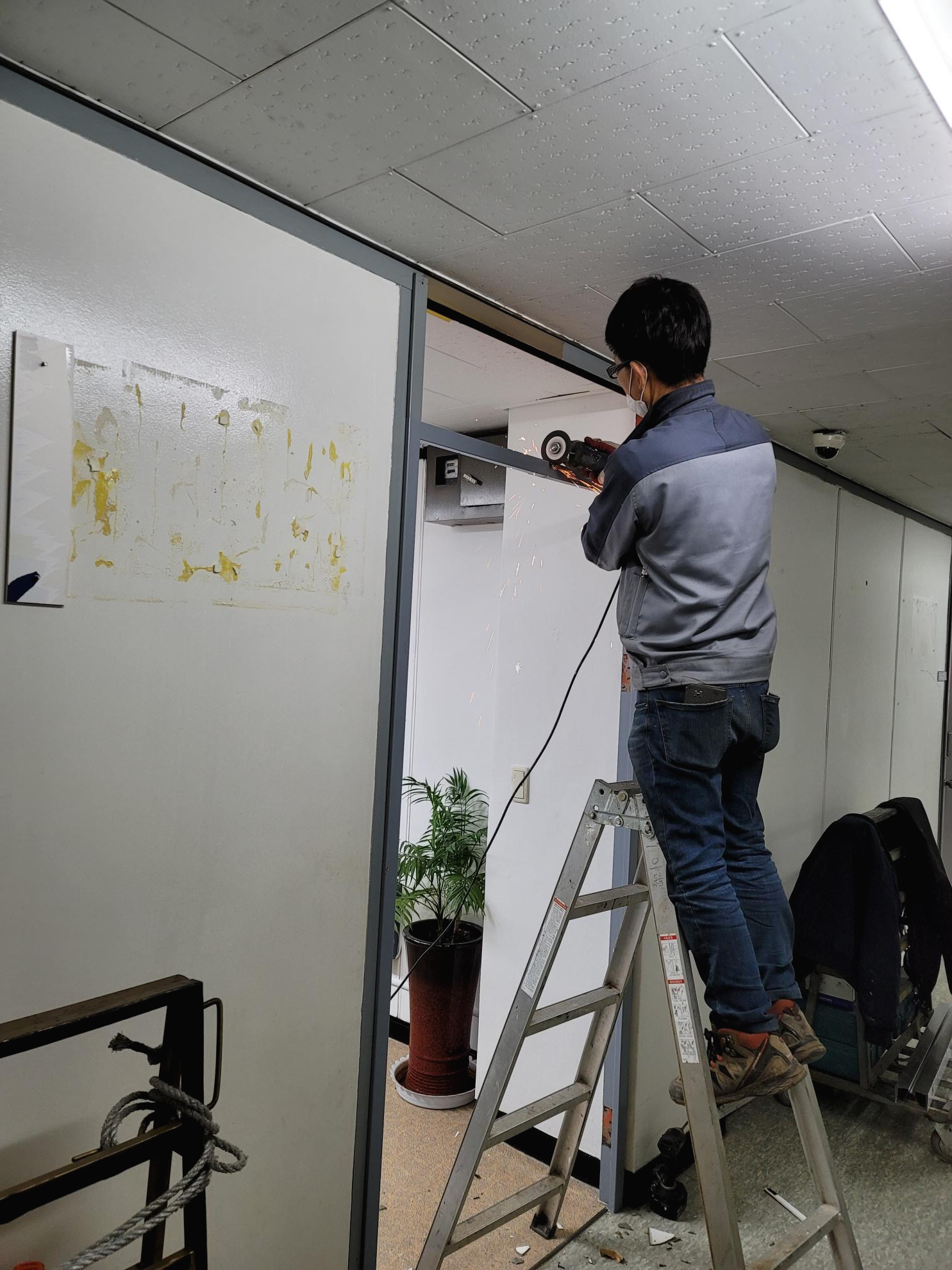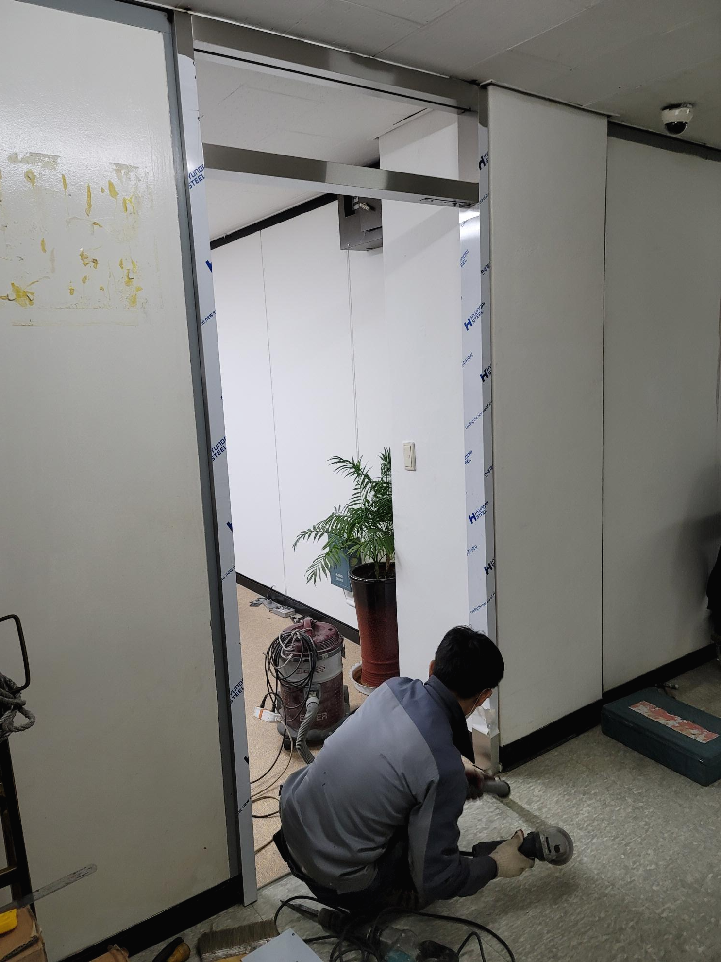 기존 도어와 프레임을 철거를 하고, 스텐 프레임을 세우고 용접을 합니다.