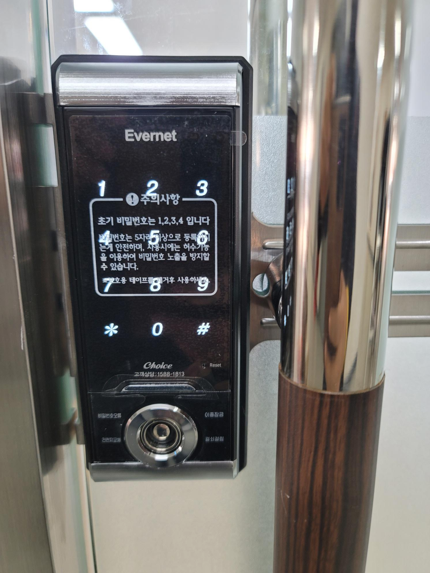 강화도어를 설치하고, 엠보시트지 작업과 번호키까지 설치하면 작업은 마무리 됩니다.