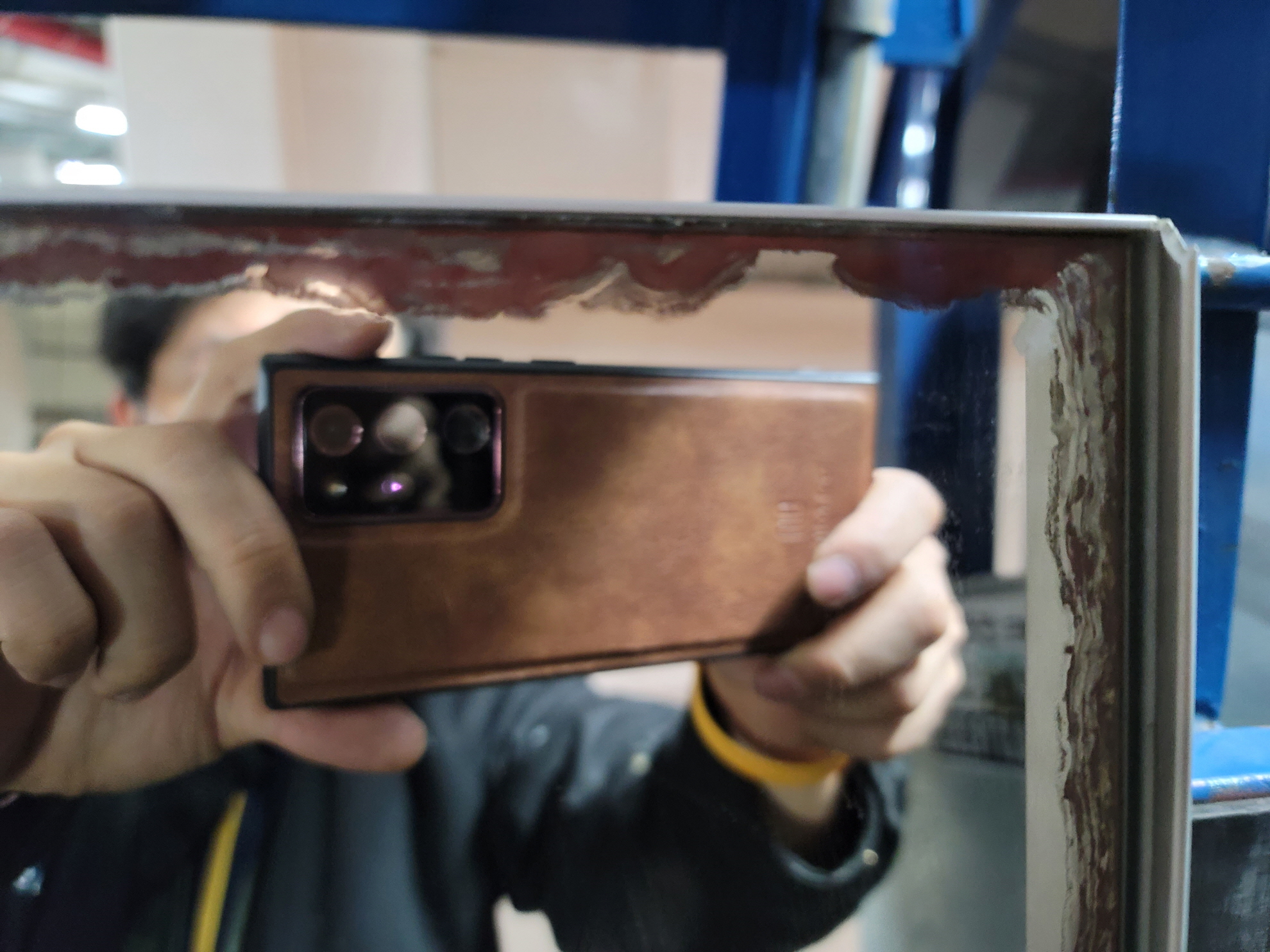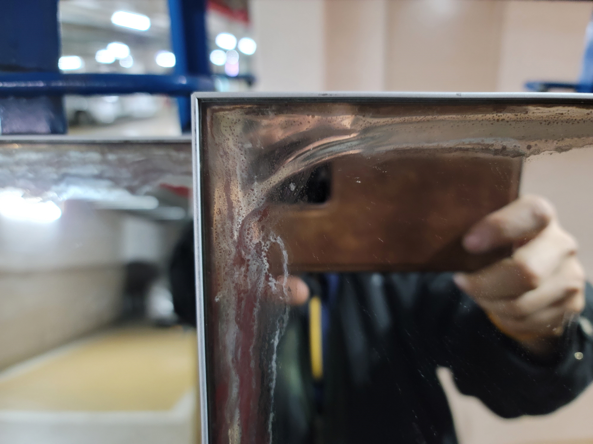 거울이 오래되면 유리 뒤편에 금속코팅막이 부식이 되어서 변색이 일어나게 되는데