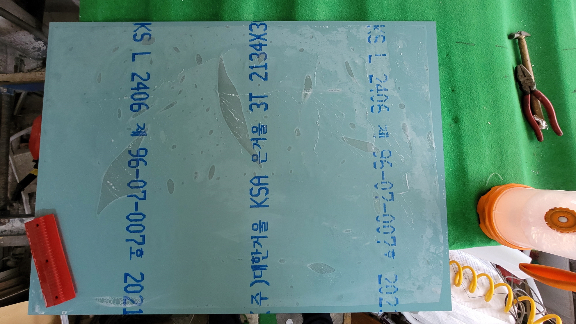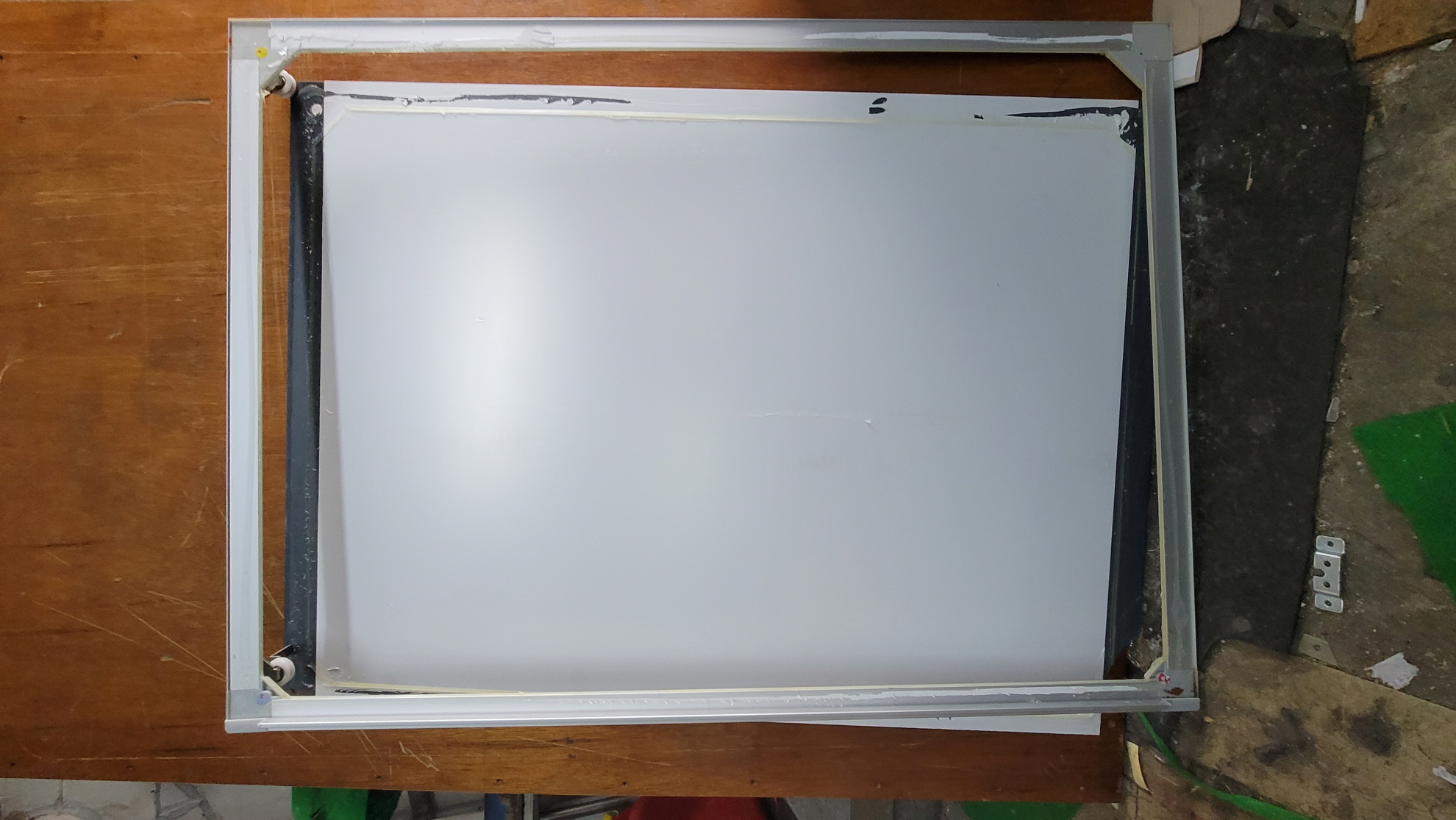 필름을 부착하고 프레임과 거울을 조립하고, 실리콘이 굳어 떨어지지 않도록 하루이틀 양생을 하고