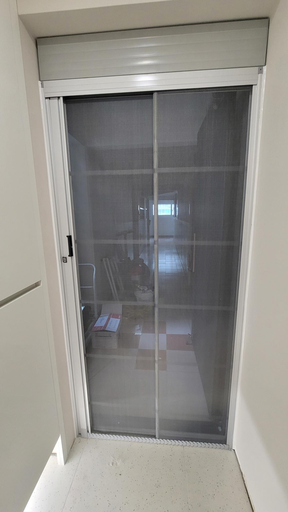 관악구 청림동에 위치한, 관악푸르지오아파트. 현관 롤방충망(무턱이 방충망 ) 시공을 해드렸습니다.