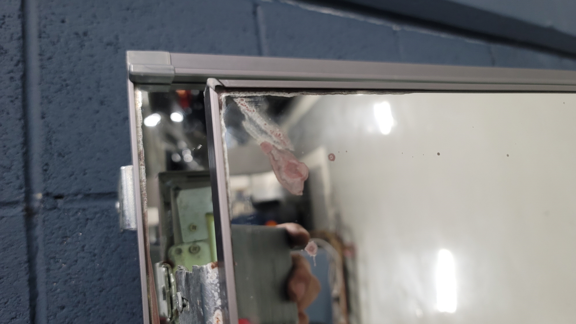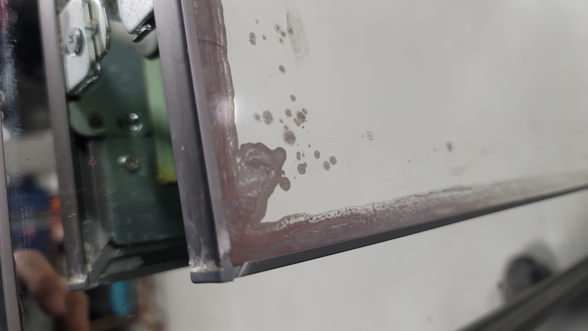 교체전, 부식이 진행되어 변색이 된 거울 모습입니다.