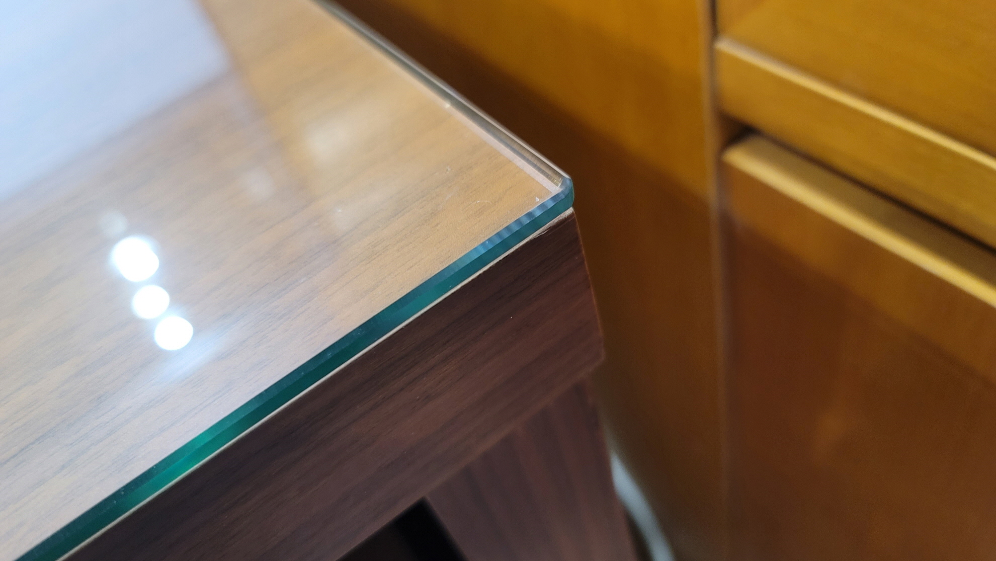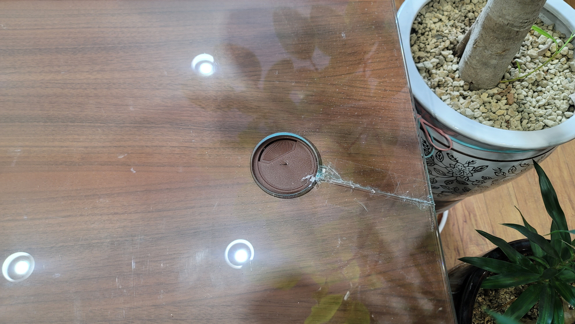 유리가 책상상판과 밀착되지 않아서 떠있게 되고, 이 상태에서 힘을 받아서 파손된 걸로 보입니다.