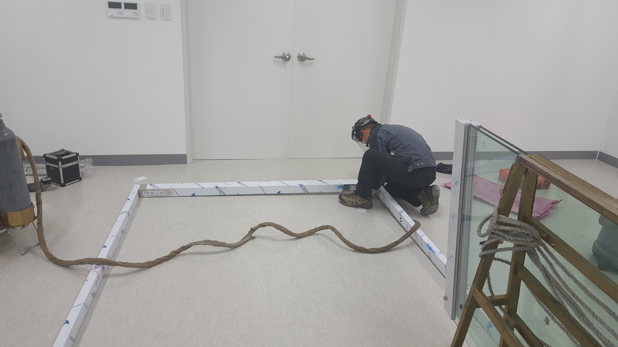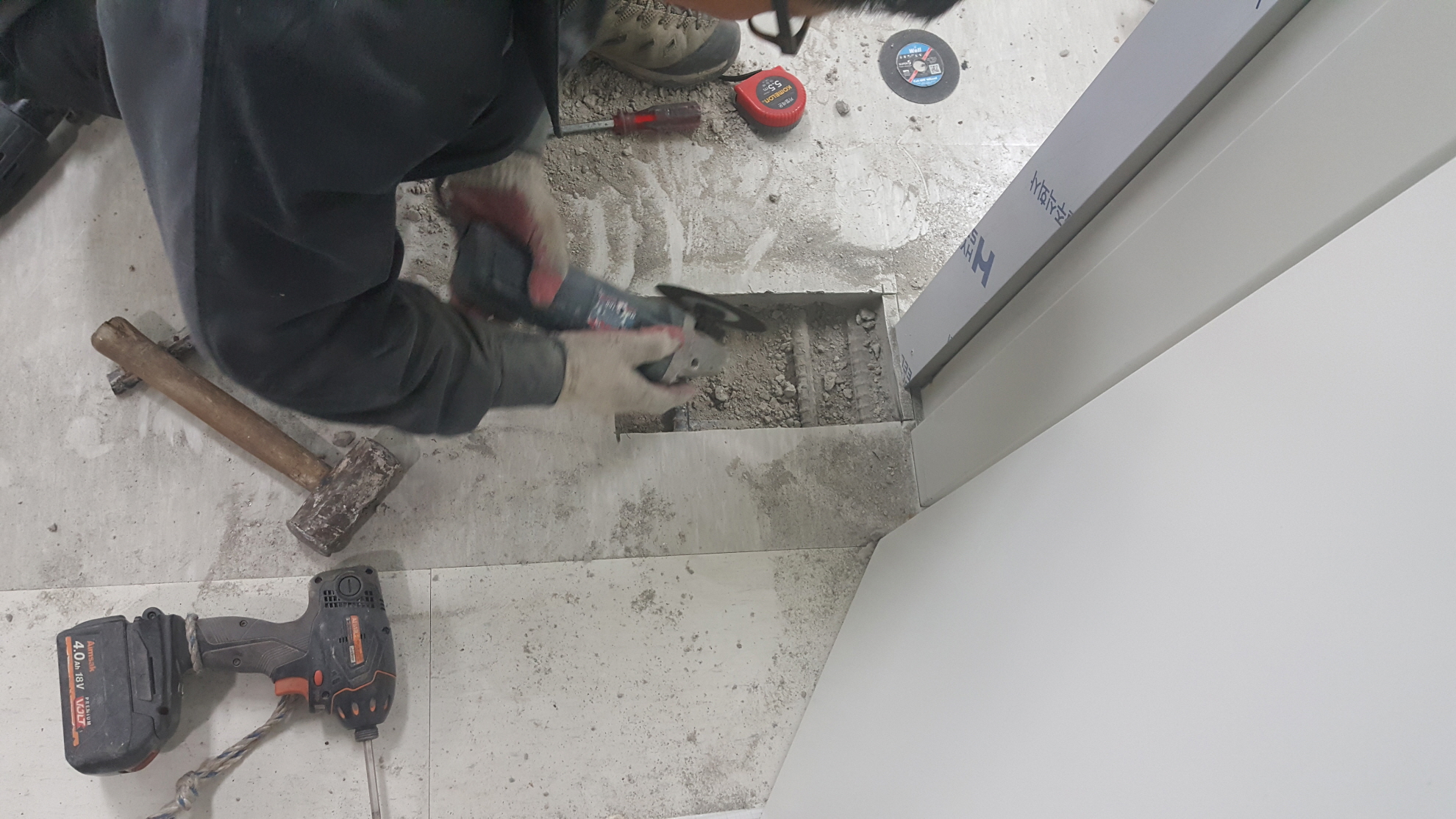 프레임 설치후 강화도어힌지 플로어힌지를 매립하기 위해 작업을 합니다.