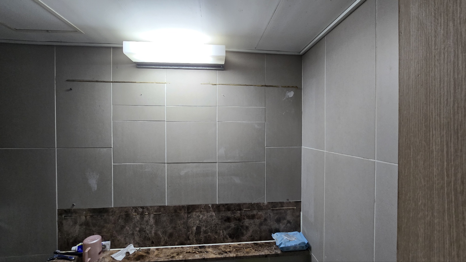 벽에 고정대를 설치하고, 새로운 욕실슬라이드장을 설치합니다.