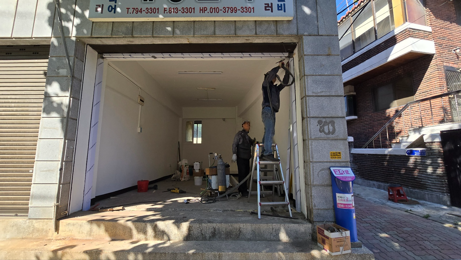 출입문 쪽도 기존 알루미늄 프레임을 철거하고 스테인레스 프레임을 설치합니다.