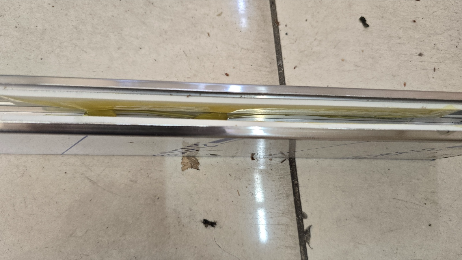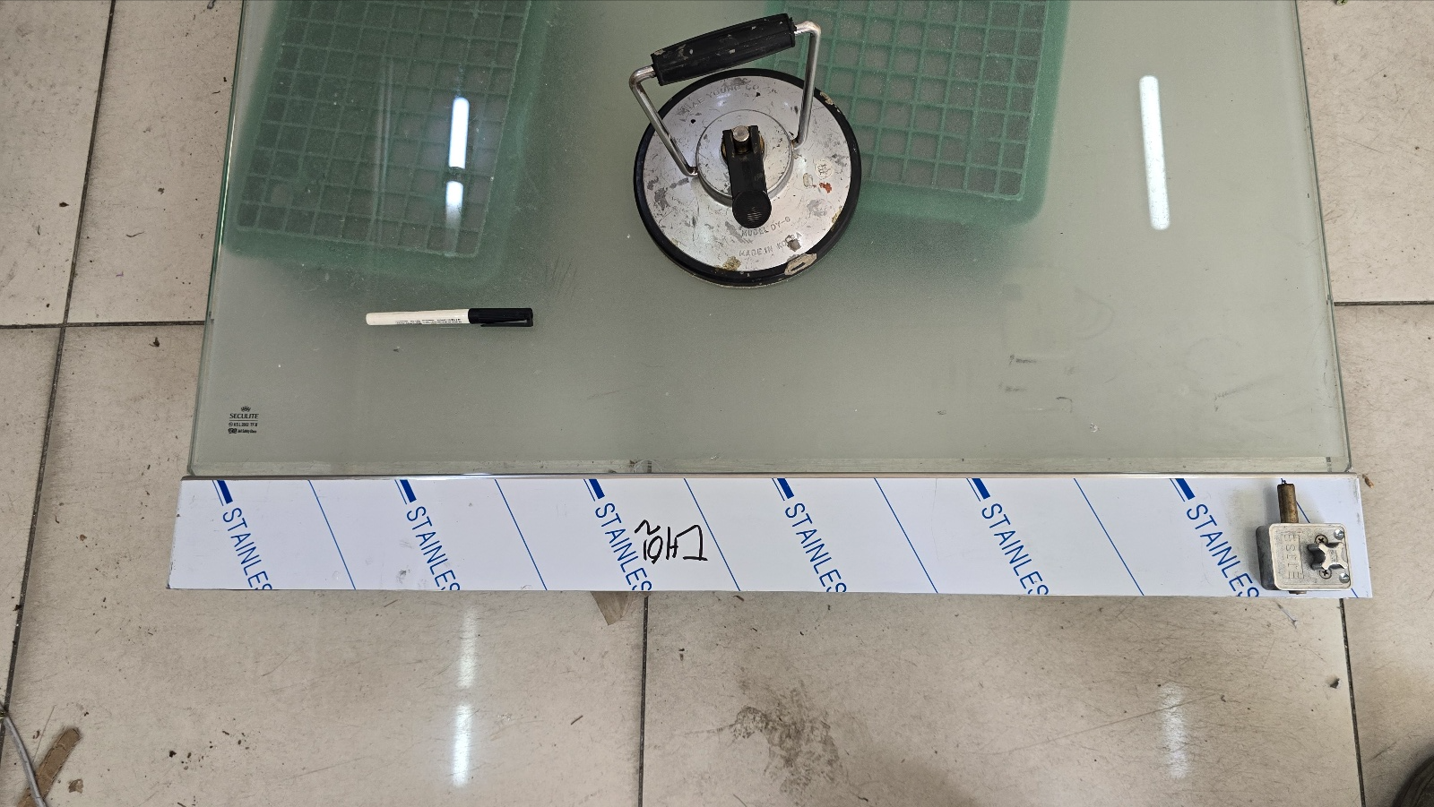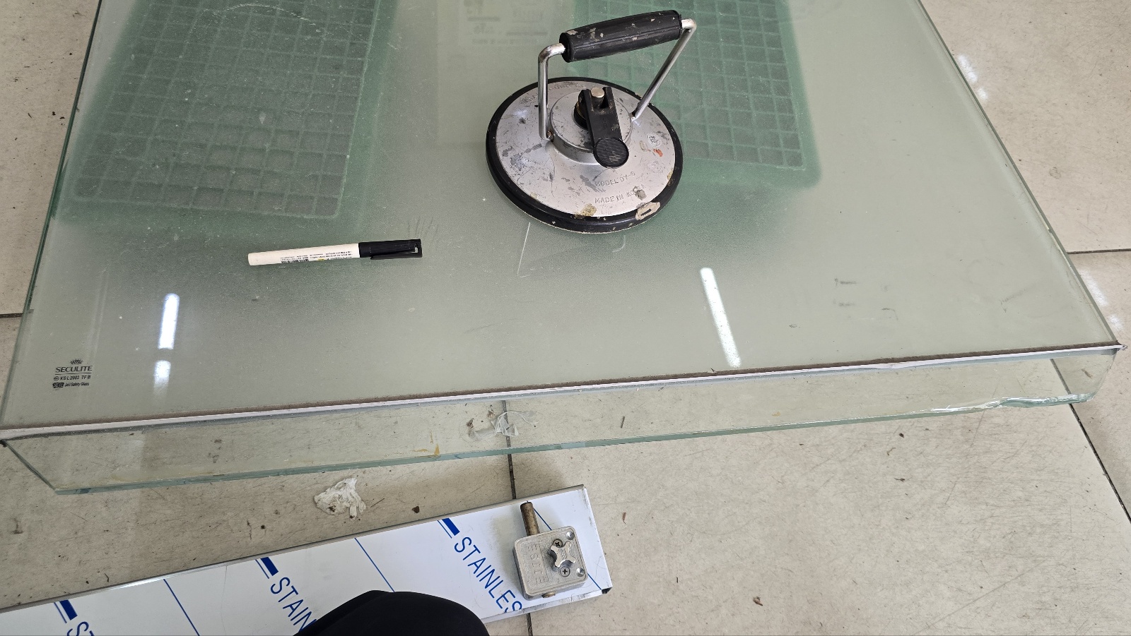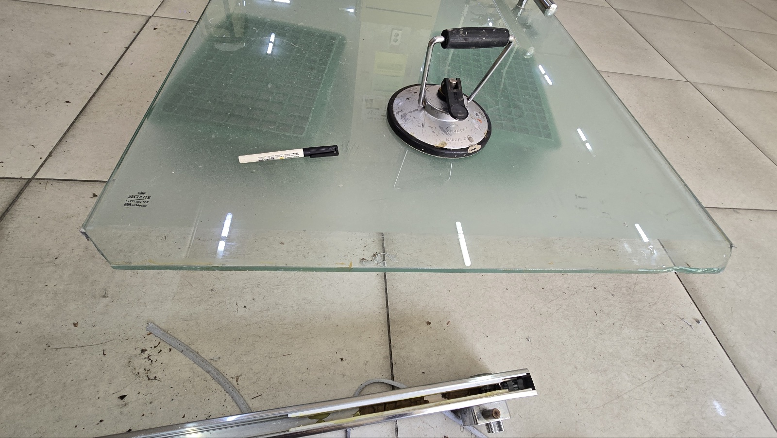 강화도어와 H바 프레임이 부착될 부분에 실리콘등 이물질을 깨끗하게 제거합니다.