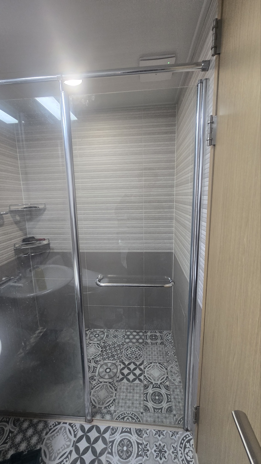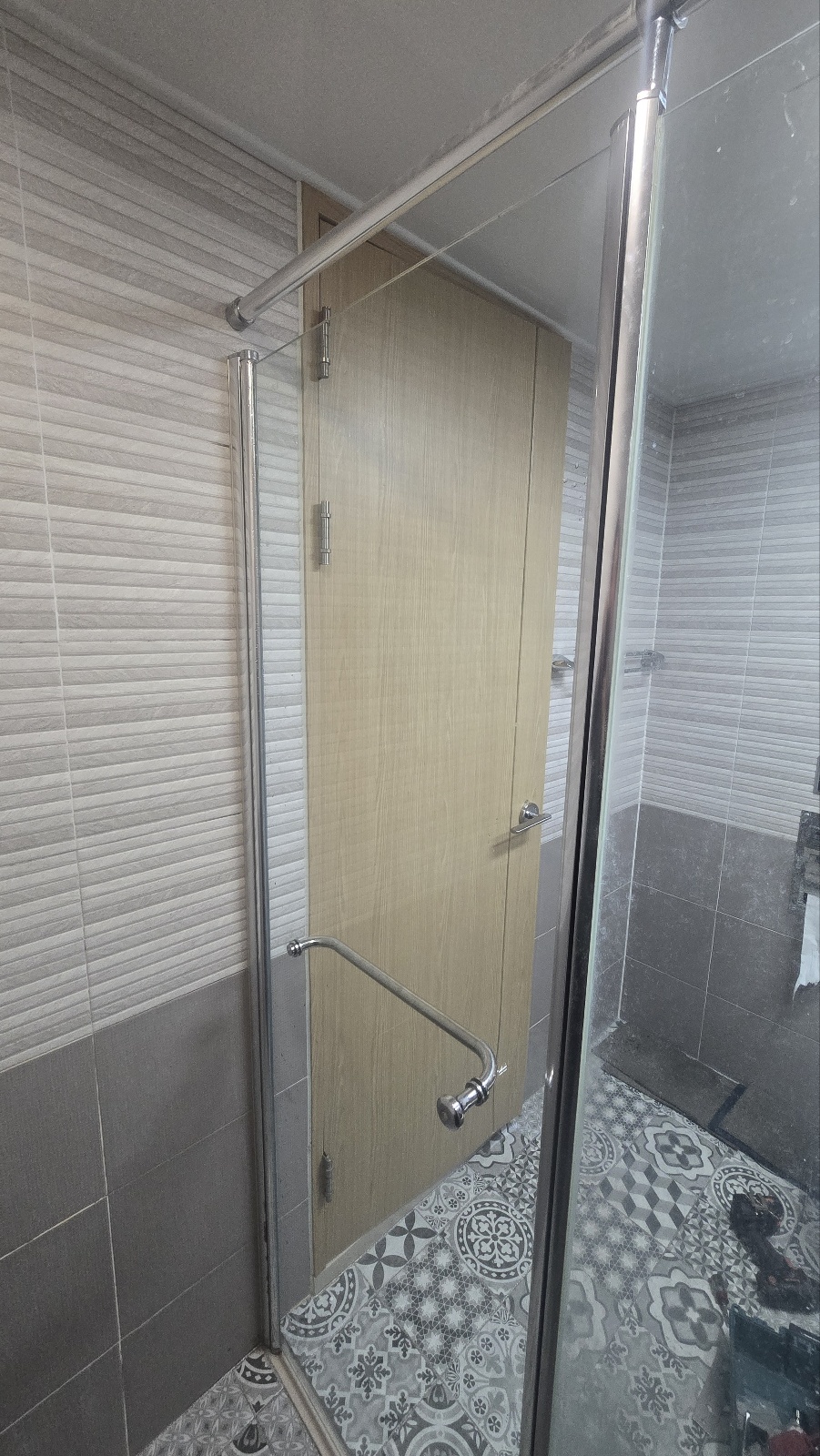 새로 제작된 샤워부스유리문을 설치하고