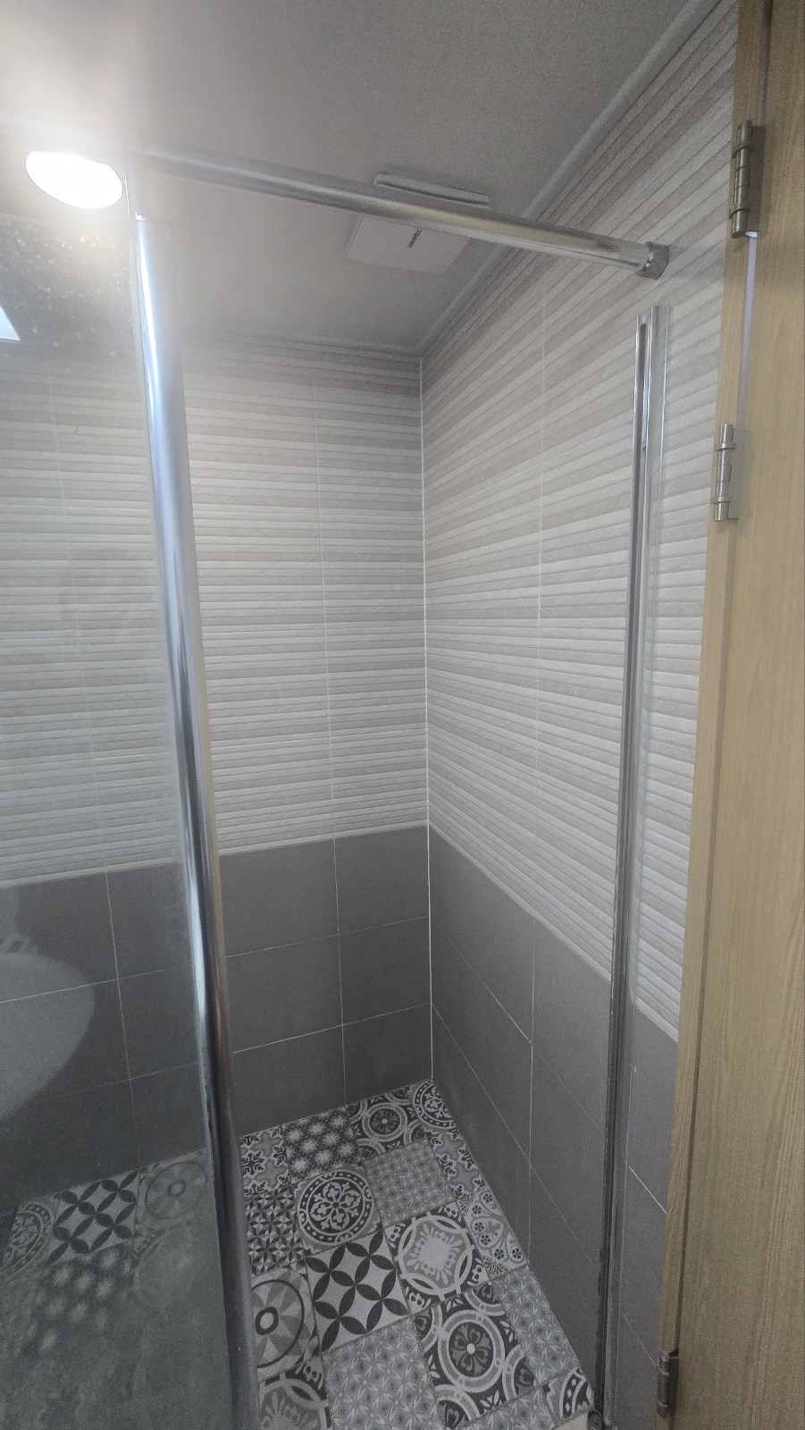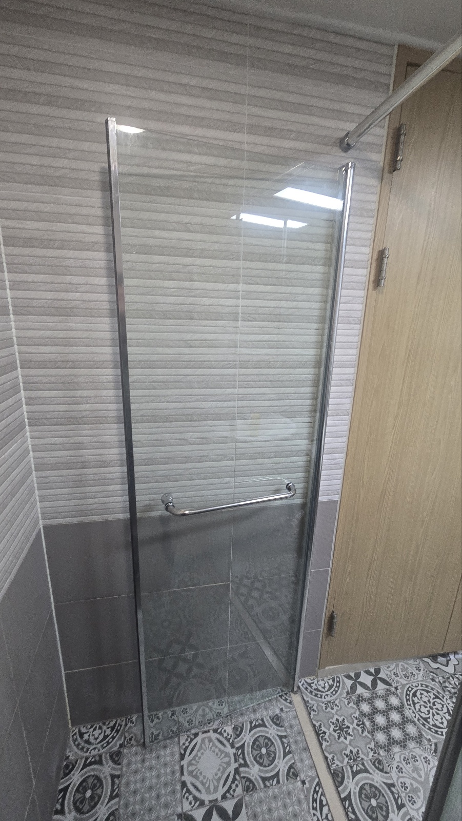 새로 제작된 샤워부스유리문을 설치하고