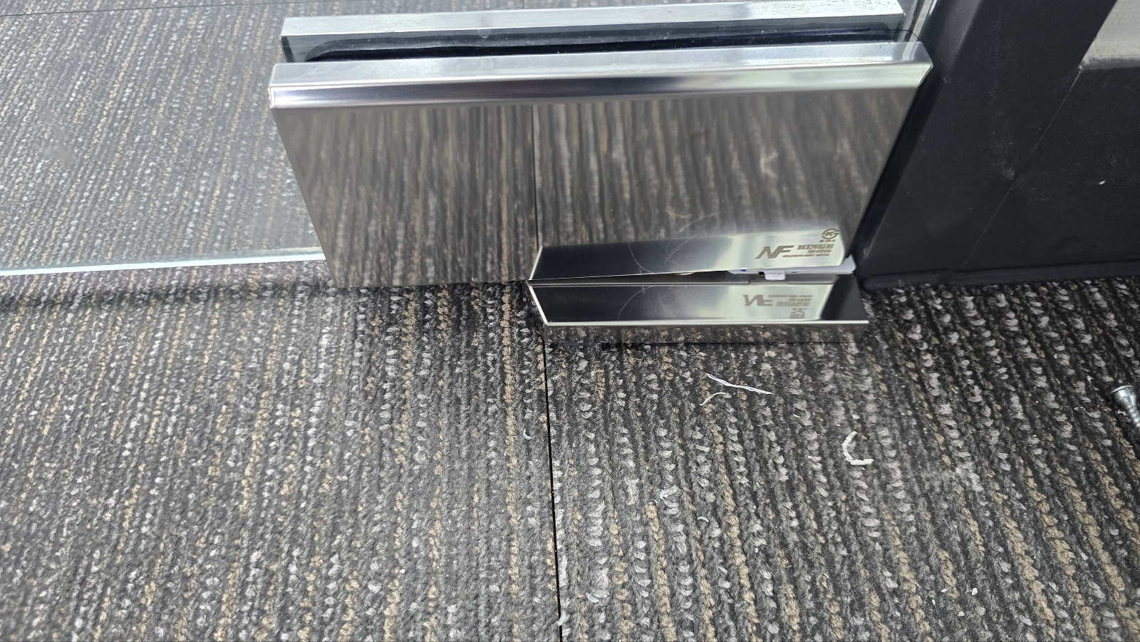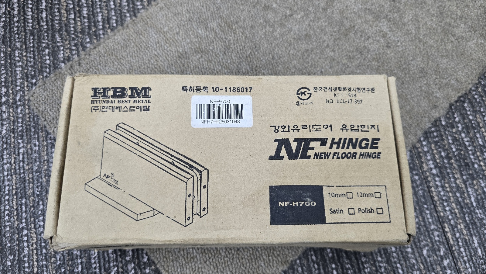 NF 힌지는 바닥에 피스로 고정을 하기때문에 시공시 소음과 먼지가 거의 발생하지 않는 점이 장점입니다.